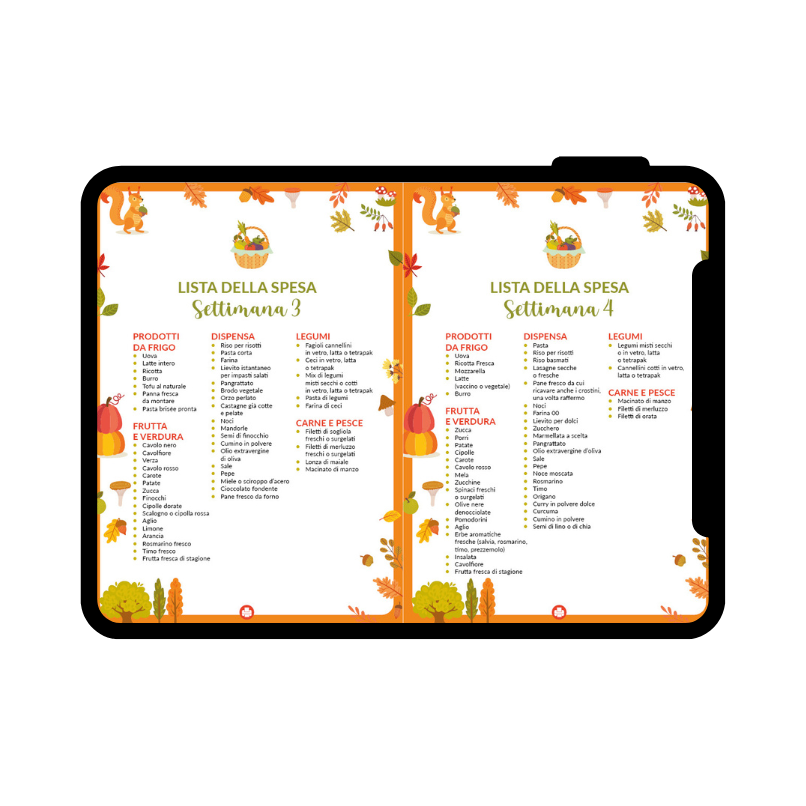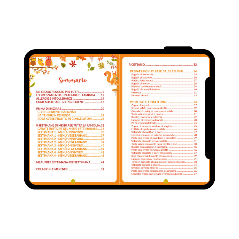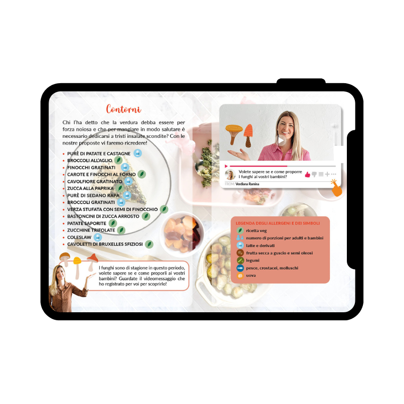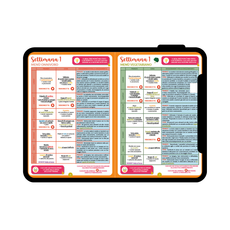 ● Tabelle pratiche: grammature indicative, planner settimanale, lista della spesa, sostituzioni dei principali ingredienti per organizzare i pasti di tutta la famiglia.